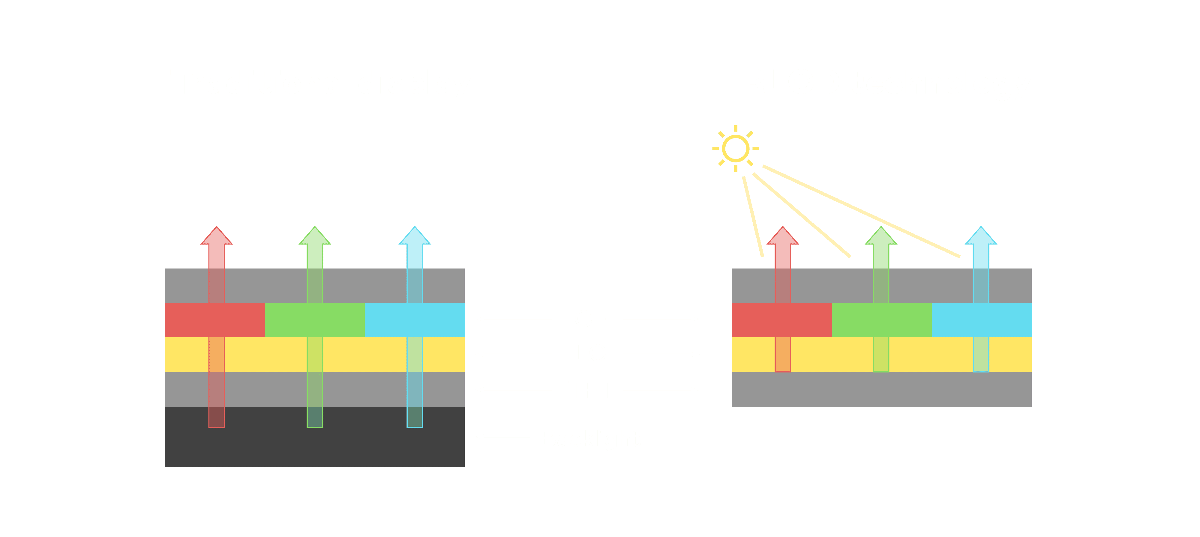 与传统需搭配背光单元的液晶显示相比,,,反射式液晶技术不仅更省电、、更轻薄,,,且即便在艳阳下仍能清晰显示。。。此外,,,,少了背光单元,,,,也大幅降低了 LED 蓝光伤害眼睛的疑虑。。。
